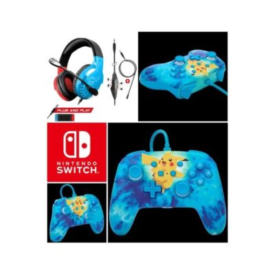 Manette filaire SWITCH Pokémon Pikachu Tie Dye Officielle Nintendo avec Câble USB détachable + CASQUE SWITCH ROUGE BLEU