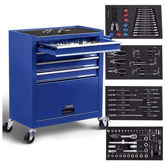 AREBOS – Chariot à outils avec 81 pièces | 4 tiroirs + compartiment | Acier robuste | BleuOrganisez, rangez et accédez à vos outils comme un pro !Ce chariot d’atelier AREBOS est l’allié idéal pour tous les bricoleurs, mécaniciens ou professionnels exigeants. Il combine un ensemble d’outils de 81 pièces avec un meuble robuste en acier à 4 tiroirs + 1 grand compartiment.- Vos avantages en un clin d’œil :81 outils de base inclus (clés, tournevis, pinces, douilles, etc.)4 tiroirs sur glissières à roulement à billes pour une ouverture fluide1 grand compartiment bas pour les outils encombrants (perceuse, clé à chocs…)Tapis antidérapants pour un rangement sécuriséSerrure centrale + système anti-basculement (ouverture d’un seul tiroir à la fois)Poignée latérale + 4 roulettes (dont 2 avec freins) pour une mobilité optimalePlan de travail supérieur robuste pour garder les outils à portée de main- Caractéristiques techniques :Dimensions totales (avec roues) : 61,6 x 33 x 76 cmDimensions des tiroirs : 53,5 x 31 x 7 cmGrand compartiment bas : 53,5 x 33 x 26 cmMatériau : Acier thermolaqué, résistant aux rayuresRoues : 75 mm de diamètre / 20 mm de large (2 avec freins)Couleur : BleuPoids : env. 26 kg- Contenu de la livraison :1x Chariot à outils AREBOS81x Outils essentiels déjà triés dans les tiroirs1x Manuel d’utilisation