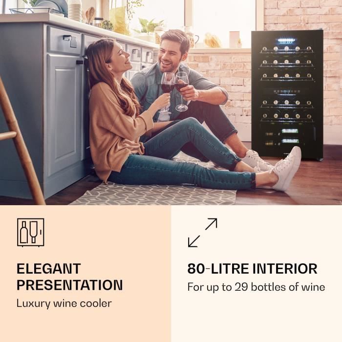 | Nom du produit | Cave à vin – Klarstein Shiraz 29 Duo – 2 zones 80 L-29 bouteilles 5-22°C – Tactile – Noire |