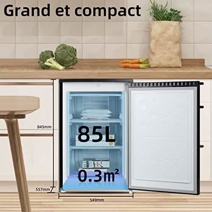 - Le mini-congélateur vertical CHiQ offre une capacité volumineuse de 90 litres tout en conservant un faible espace au sol(549*557*845mm). C’est un petit congélateur de plus idéal pour la cuisine, le garage, le bureau et le dortoir.