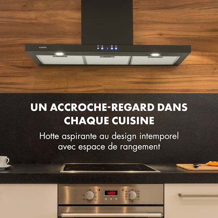 | Nom du produit | Hotte aspirante cuisine 90 cm – Klarstein – 600m³/h – hotte inclinee avec 3 vitesses – LED – hotte murale classe A++ – noir |