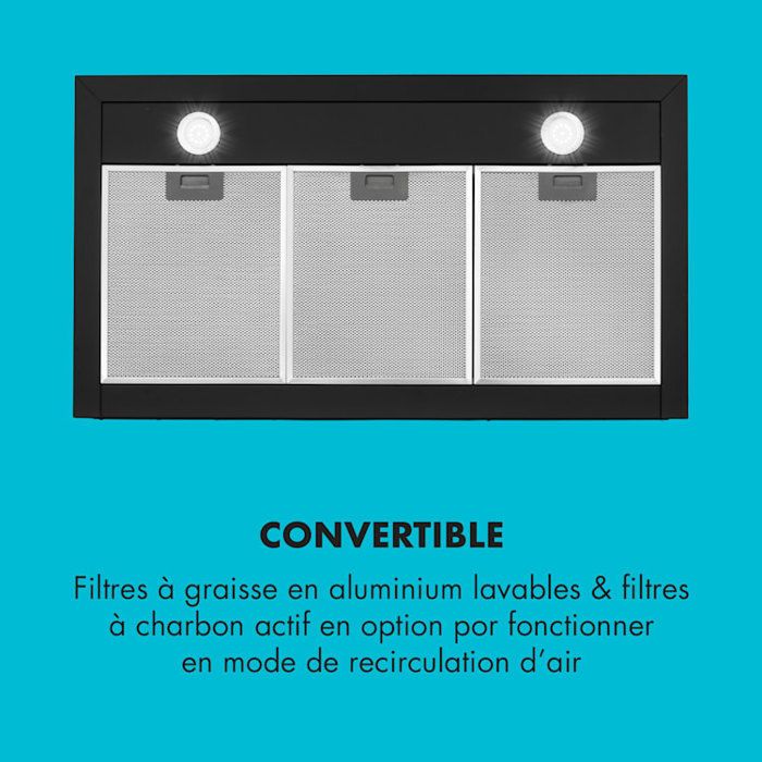 Puissante hotte aspirante pour les zones de cuisson moyennes à grandes avec classe d’efficacité énergétique A ++. Utilisation simple avec trois niveaux de puissance, minuterie et éclairage de la table de cuisson LED à économie d’énergie. Design intemporel avec espace de rangement et conversion facile en mode recirculation. La hotte aspirante Klarstein Limelight est à la fois élégante et pratique.