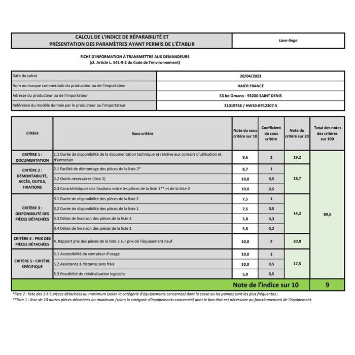 | durée de disponibilité des pièces détachées essentielles à l’utilisation du produit | 14 ANS |