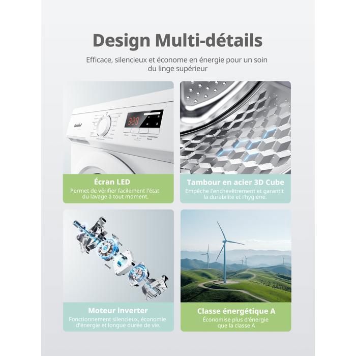 | Nom du produit | Lave-linge hublot COMFEE – 8 kg – 15 Programmes – Vapeur – 1400 trs/min – Smart Moteur BLDC – Classe A – Blanc |