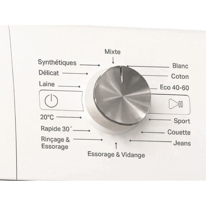 Programmes : Mixte – Blanc – Coton – Eco 40-60 – Sport – Couette – Jeans – Essorage & Vidange – Rinçage et Essorage – Rapide 30′ – 20°C – Laine – Délicat – Synthétiques. Options et touches : On / Off – Départ / Pause – FreshCare + – Départ Différé (1-24h) – Vitesse d’essorage – Température – Verrouillage des touches. |