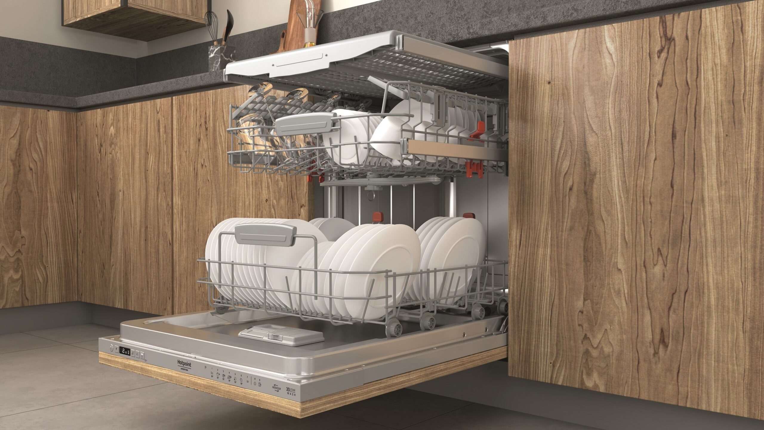 Offrez à votre cuisine un concentré de technologie et de confort avec le lave-vaisselle tout-intégrable Hotpoint HI5030WEF. Pensé pour les familles exigeantes, il accueille jusqu’à 14 couverts et propose 9 programmes adaptés à tous les besoins, du cycle rapide au lavage intensif, en passant par le mode ultra silencieux Bonne Nuit (42 dB). La technologie ZoneWash 3D, avec son bras de lavage supplémentaire et ses jets puissants, garantit un nettoyage ciblé ultra efficace ou une économie d’énergie jusqu’à 40 % en demi-charge. Grâce à ActiveDry, la porte s’ouvre automatiquement en fin de cycle pour un séchage naturel, optimal et économe, avec +98 % d’efficacité comparé à un système classique. Son moteur à induction Inverter assure un fonctionnement fiable, silencieux et économe. Et avec seulement 43 dB, il sait se faire discret. Côté aménagement, le troisième tiroir à couverts, les paniers réglables et les picots rabattables permettent d’optimiser l’espace et d’accueillir même les ustensiles les plus encombrants. L’interface digitale, le départ différé, les voyants lumineux au sol (Start2EndLight) et la sécurité anti-fuite rendent son utilisation simple et rassurante. Il s’intègre facilement en colonne et accepte un raccordement à l’eau chaude. Un allié du quotidien, aussi pratique que performant, pour une vaisselle impeccable sans effort.