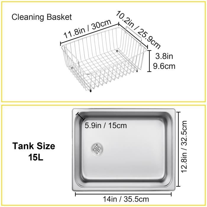 Ce nettoyeur à ultrasons de 15L est fabriqué en acier inoxydable SUS304 et dispose de 6 kits de transducteur. Il possède une puissance ultrasonique de 360W et une puissance de chauffage de 400W. La fréquence est de 40 kHz et la capacité du réservoir est de 13,5-15 L. La température peut être réglée de 0 à 80 ℃ et l’heure de 1 à 30 minutes.