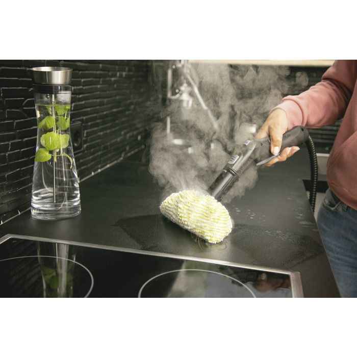 Ultra-pratique, le SC 4 EasyFix Iron nettoie sans produits chimiques et peut être employé dans toute la maison. L’intensité de la vapeur peut être ajustée en fonction de la surface et du degré d’encrassement grâce au réglage sur 2 niveaux. Le nettoyage en profondeur avec le nettoyeur vapeur Kärcher élimine jusqu’à 99,999 % des virus* et 99,99 % de toutes les bactéries domestiques** présents sur les surfaces dures courantes de la maison. Grâce aux accessoires adaptés, l’appareil offre des résultats exemplaires sur le carrelage, les plaques de cuisson et la hotte, jusque dans les moindres interstices. Même les saletés incrustées sont éliminées de manière fiable. Le fer à repasser vapeur fourni permet de réduire de moitié le temps de repassage habituellement nécessaire. Le suceur pour sol EasyFix se distingue par son articulation flexible assurant une excellente ergonomie et par une technologie de lames de racleur offrant des résultats de nettoyage parfaits. La lingette de sol se fixe facilement et rapidement sur le suceur pour sol grâce à un système pratique de bandes autoagrippantes et se retire sans contact avec la saleté. Le réservoir à eau amovible est remplissable en permanence, pour un nettoyage sans interruption. Autres équipements détaillés : rangement pour cordon intégré, compartiment pour accessoires, position de stationnement du suceur pour sol.