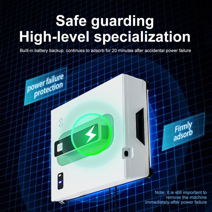 【 forte aspiration, ne tombe jamais 】 notre Robot de nettoyage de vitres dispose d’une technologie avancée de moteur à vide, offrant une puissante aspiration de 2800 Pa pour s’assurer qu’il reste fermement attaché aux surfaces. Ce robot nettoyeur de vitres est conçu avec un UPS (uninterruptible power supply) intégré.