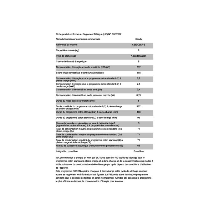 | Nom du produit | Sèche-linge condensation 9 kg Candy CSEC9LF-S |