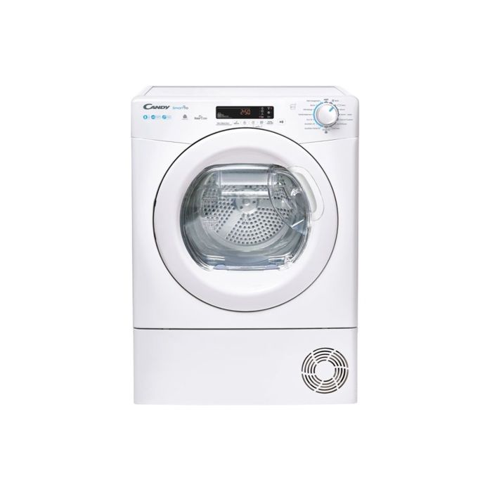 SECHE LINGE CANDY CONDENSATION POMPE A CHALEUR – CHARGEMENT FRONTAL HUBLOT – 8KG – DEPART DIFFERE 24H – 67DB – VOLUME TAMBOUR 115L ACIER GALVANISE – ROTATION ALTERNEE – BAC DE RECUPERATION D’EAU EASY CASE DANS LA PORTE – 15 PROGRAMMES – CLASSE ENERGIE A++ – CLASSE EFFICACITE CONDENSATION B