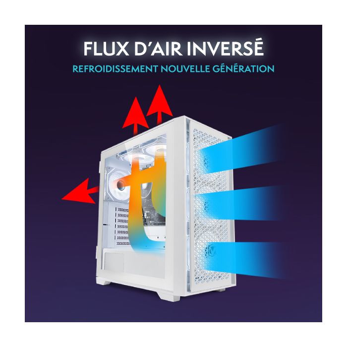 | Caractéristiques | Panneau avant à effet miroir infini | Flux d’air exceptionnel | Conception compacte en verre | Superbe RGB, vue complète des composants |