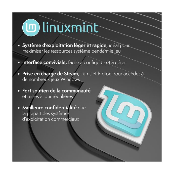 Ce PC de jeu d’entrée de gamme est idéal pour les joueurs occasionnels et dispose d’une carte graphique intégrée capable de gérer facilement les titres moins exigeants et les jeux indépendants. Parfait pour les débutants ou pour toute personne recherchant un système abordable avec un potentiel de mise à niveau future. Processeur AMD Ryzen 3 3200G – 4 cœurs – Vitesse maximale de 4,0 GHz Puce graphique Radeon Vega 8 intégrée Le SSD NVMe de 1 To offre un stockage ultra-rapide pour les jeux et la productivité La RAM DDR4 double canal de 16 Go cadencée à 3200 MHz garantit un multitâche fluide et de meilleures performances système Ce PC est livré sans système d’exploitation Windows et est livré avec Linux Mint préinstallé par défaut, vous offrant la possibilité d’installer vous-même votre système d’exploitation préféré.